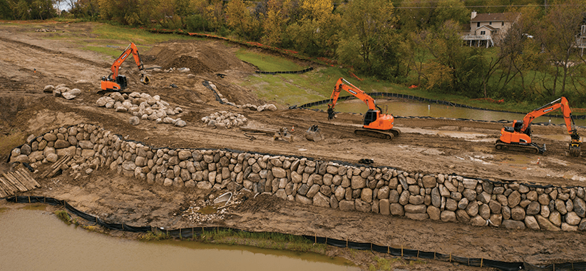 Building boulder walls requires larger equipment, particularly for lifting and placing tasks. After nearly four years with other crawler excavators, the family was introduced to a new brand — Doosan.